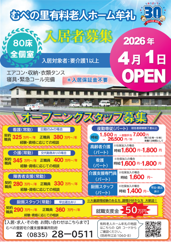 社会福祉法人むべの里光栄では、むべの里光栄 牟礼(防府市)のオープンにむけ